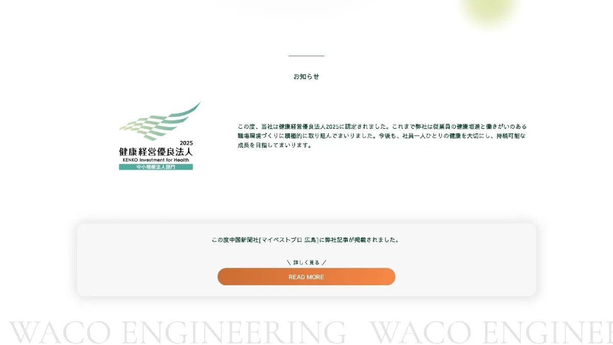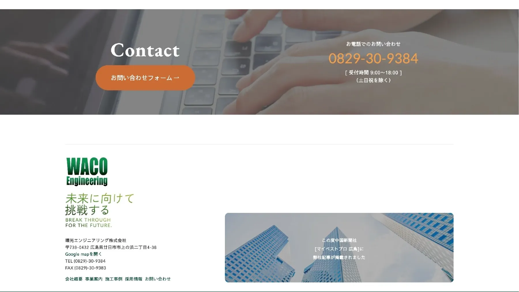 広島のマンション大規模修繕の会社のホームページ制作をご依頼いただきました。多岐にわたる事業領域と技術力が一目で伝わるよう、下層ページで情報を整理し読み手が迷わないサイト構成に。確かな技術力と実績を感じられるように、ロゴのグリーンに合わせて、重厚感のある配色と余白を活かしたデザインに仕上げました。